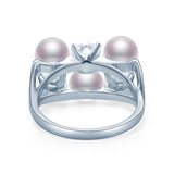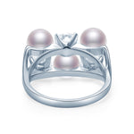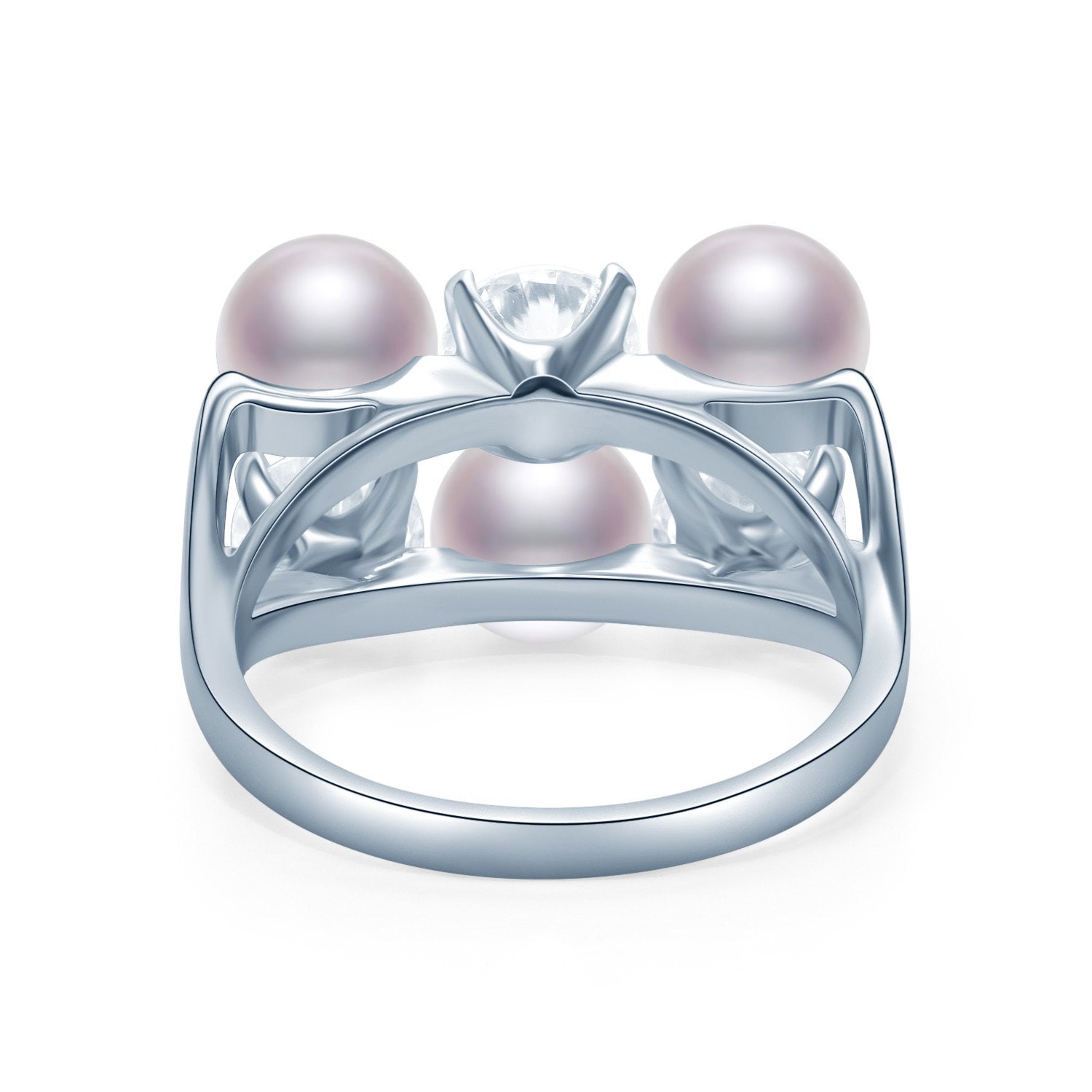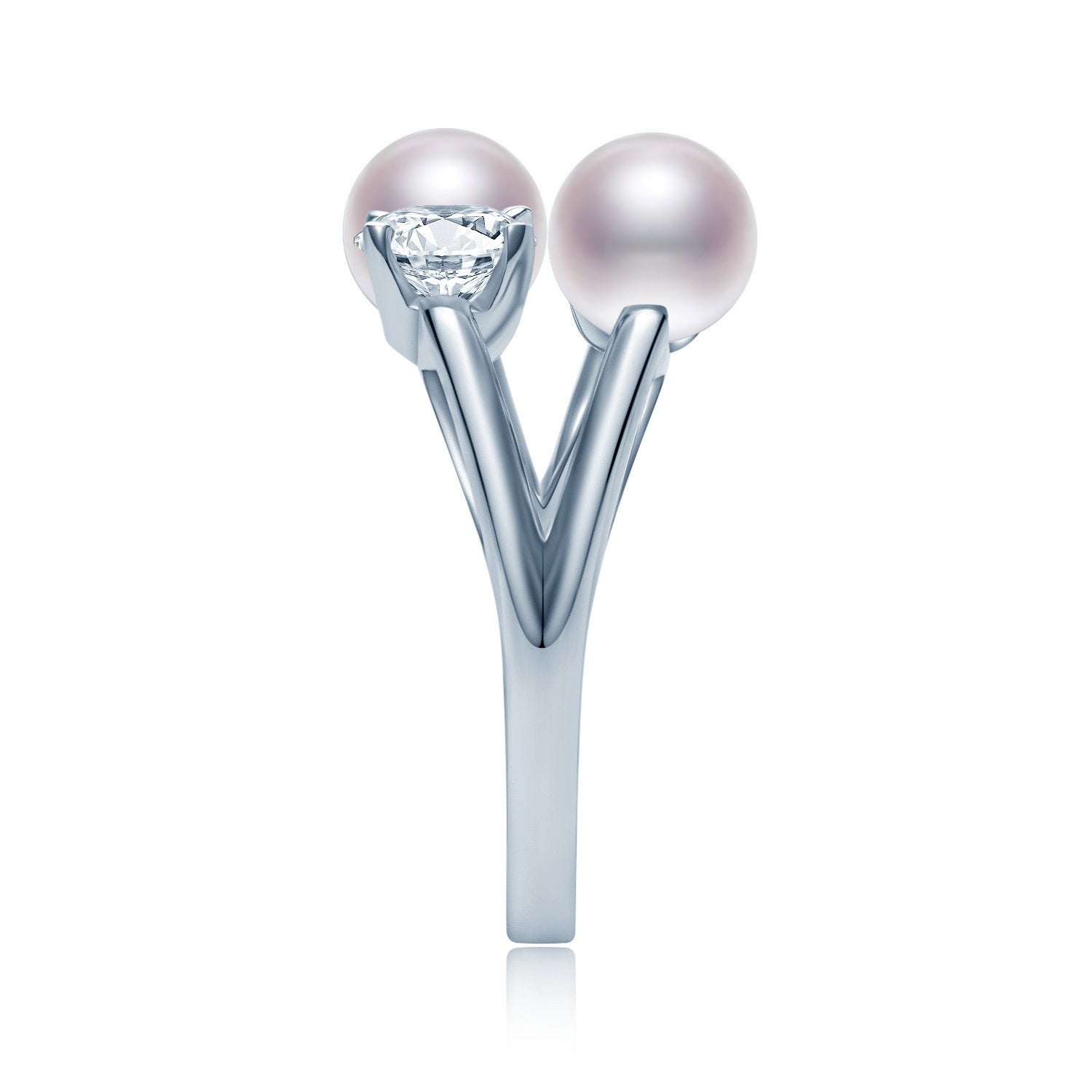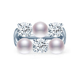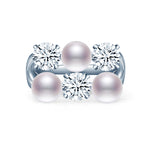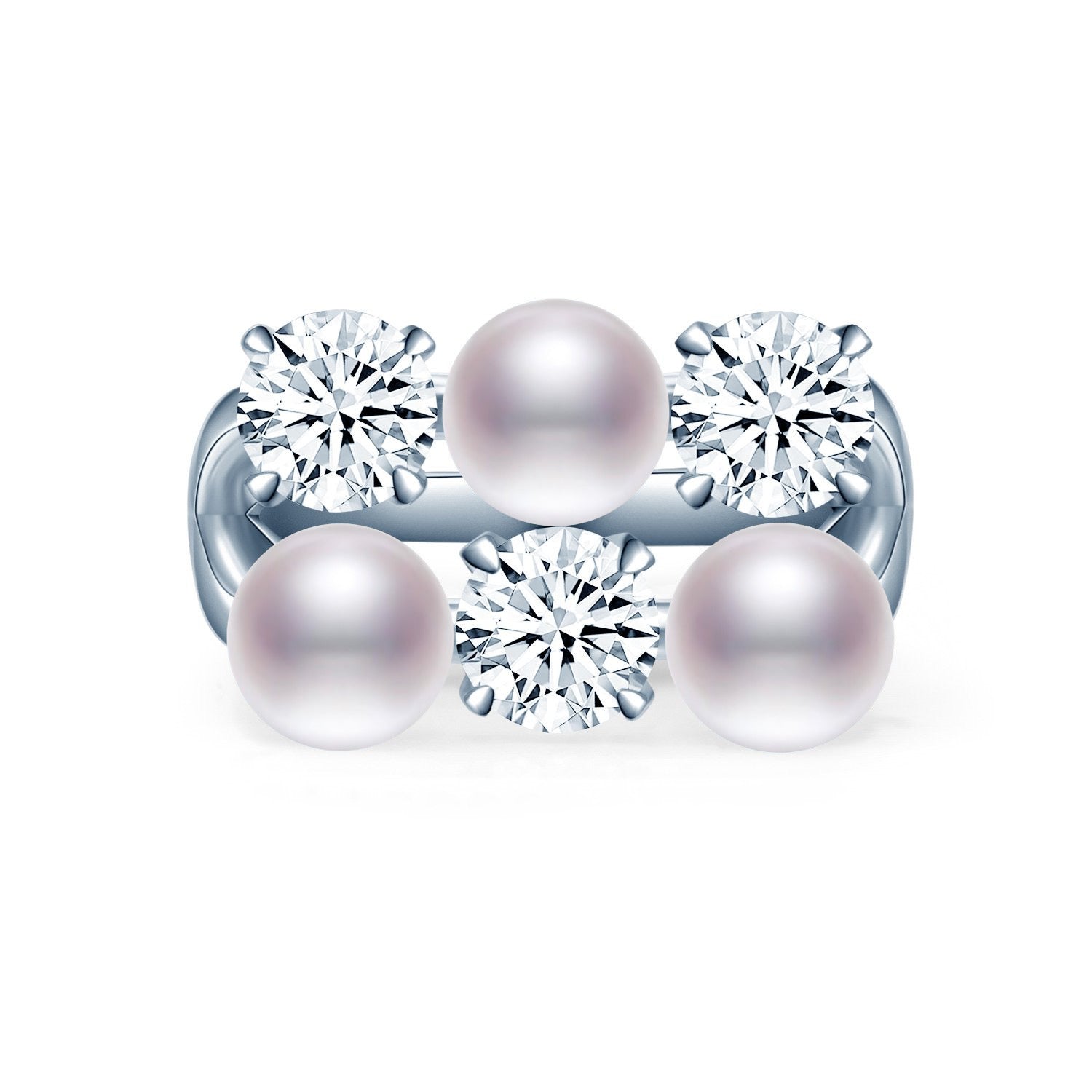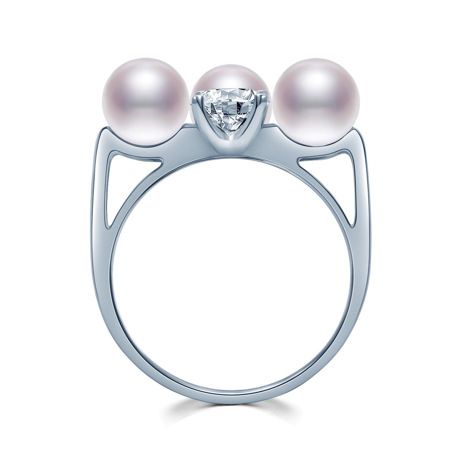 0.6ctのモアサナイト三つと6mmのパール三つが惜しみなく互いにその輝きを引き立たせる。